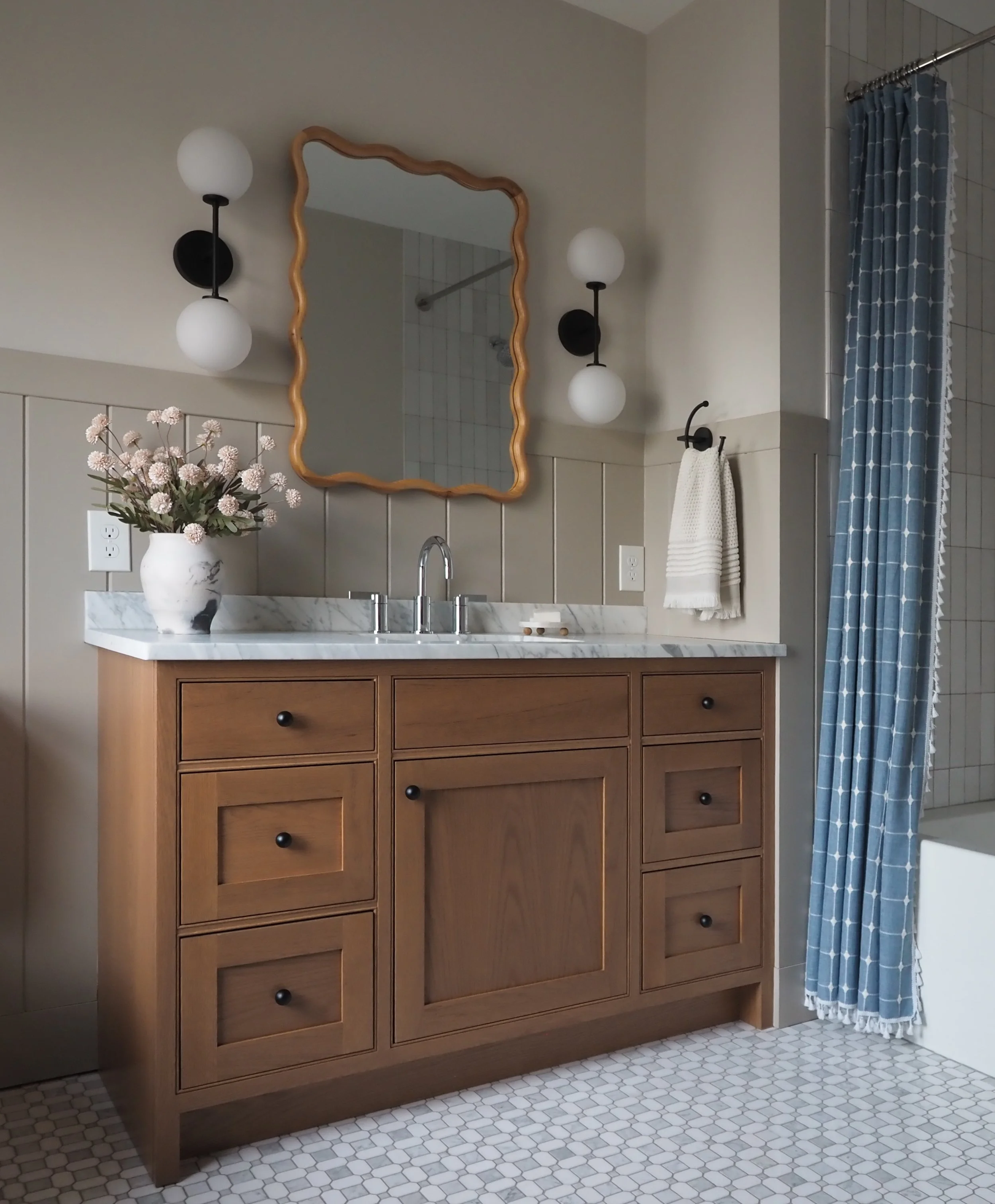 Finishes were selected to honor the home’s original architecture and time period, including v-groove paneling, mosaic marble flooring, and marble countertops. A white oak vanity with a natural finish keeps the space feeling light and approachable. The result is a timeless, functional bathroom designed to support everyday family life.
